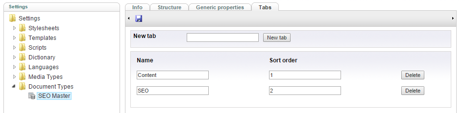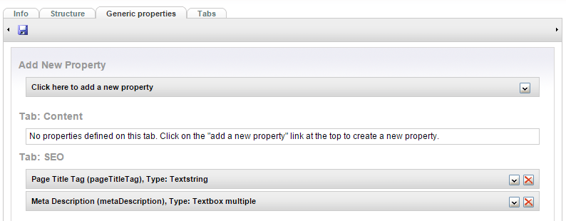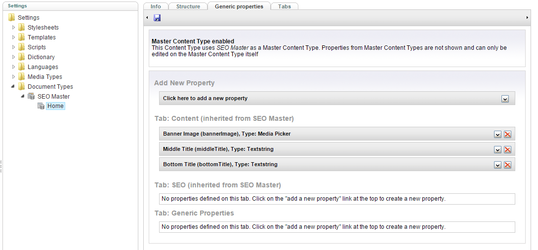 The content tab is left blank so that any document types that are children of the master will inherit this tab and you can put the page’s content properties on that tab. For basic purposes it’s best to setup a page title tag and meta description fields on your SEO tab.