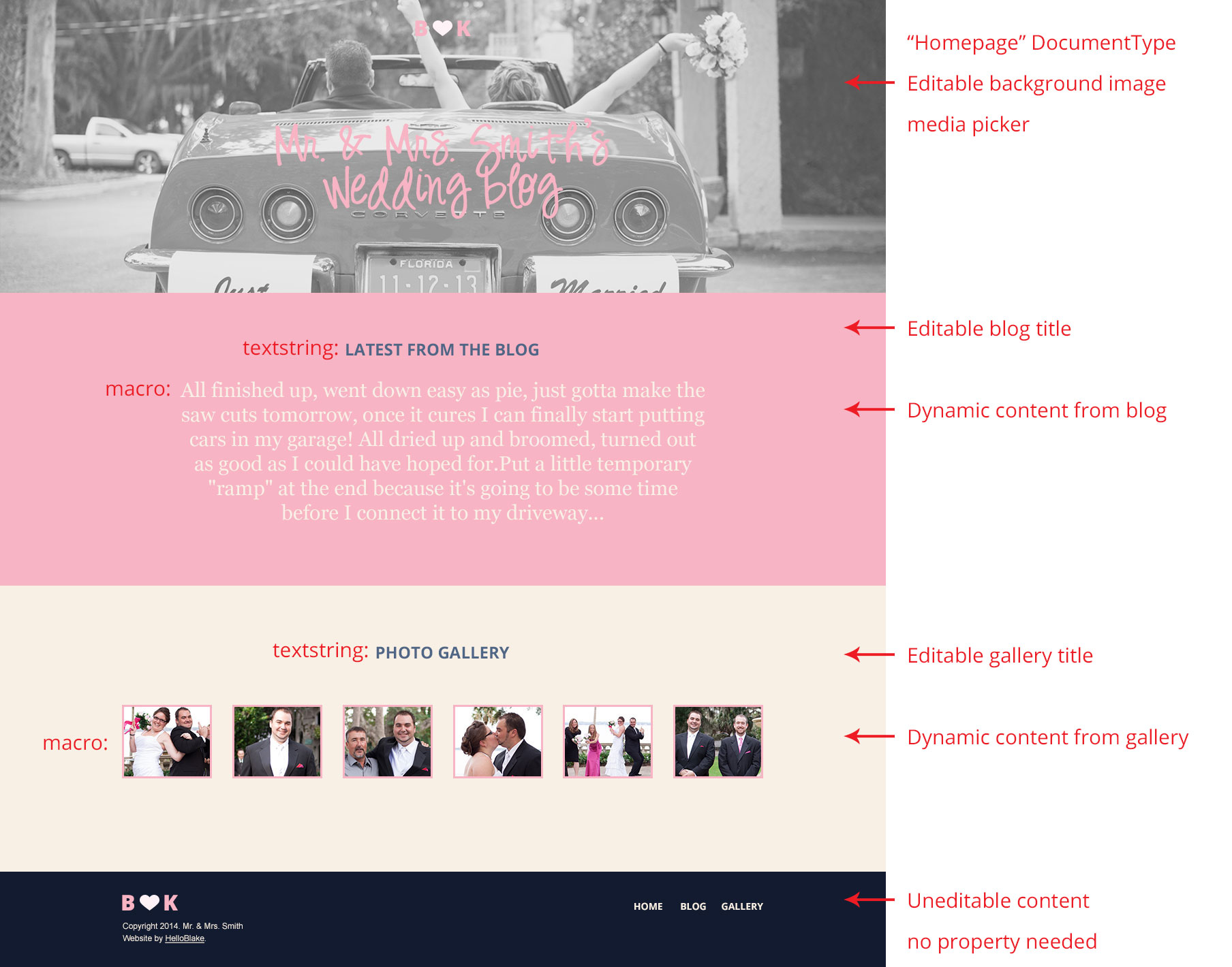 The homepage was designed with Bootstrap’s 12 column grid in Photoshop. I took the homepage design and divided it up to figure out what I wanted to be editable for this particular “Homepage” DocumentType. The design is really simple so there isn’t going to be much editable content on the homepage of this website. Looking at the design we can determine that the properties on this document type are: