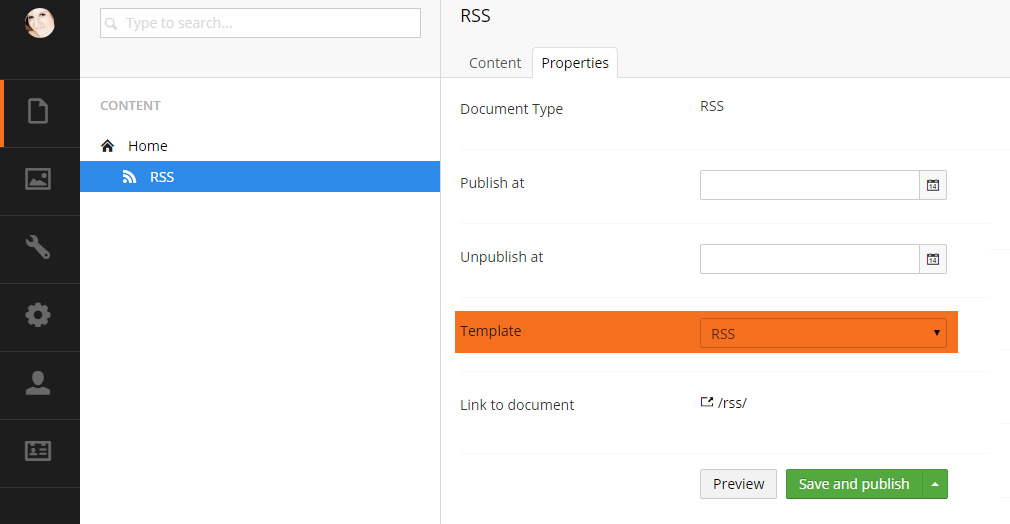 First let’s make sure we have a node in the Content section that has the RSS template assigned to it.