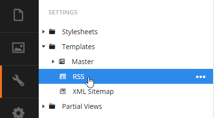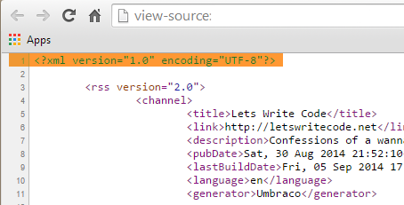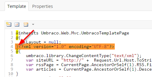 I wrote this razor directly on the template itself because when I used a partial view, my XML version declaration would appear on line 2 of my source code and I was getting the error I mentioned above. I found the only way to get my XML version declared on the first line was to put my code directly on the template. Typically I don’t recommend writing your razor scripts directly on your template but in this case we know this page is a one off, I know I won’t be using this RSS code anywhere else in my site, and I get an error if I try to put it into a partial view (again, only because of line spacing).