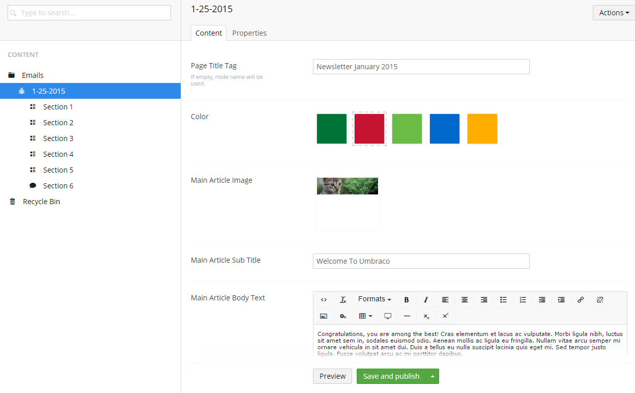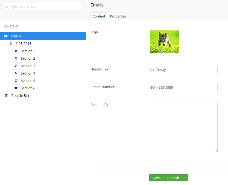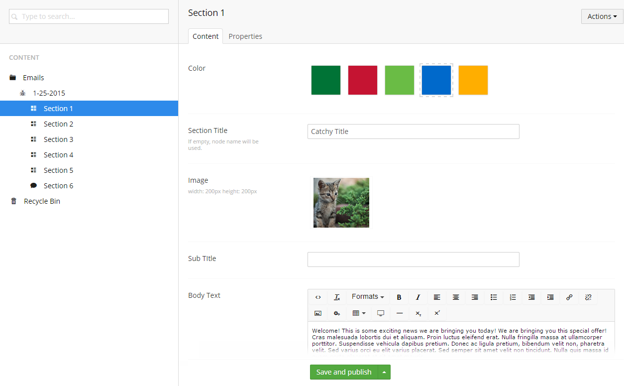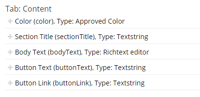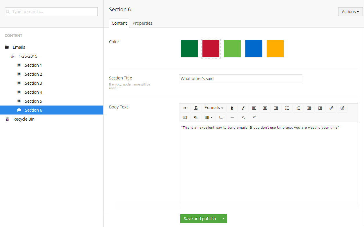 No 3. Email Section – This is where we’ve broken out the different section boxes for content items in the email. This setup allows the user to create as many different sections as they want. The template for this will generate the HTML for the box and apply the color styles to the headers and buttons based on the user’s selection on the content node.