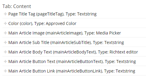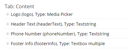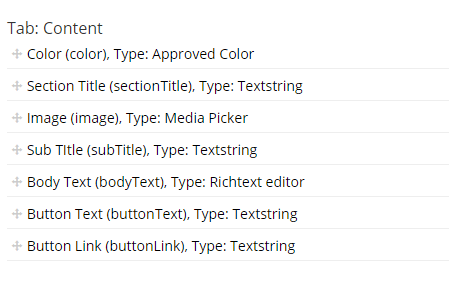 No 4. Email Section Testimonial – This will be used for our testimonial section. The layout of this area is different than a regular section and had different properties which required a document type of its own.