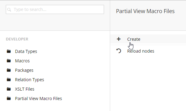In Umbraco 7, navigate to your Developer section and right click on Partial View Macro Files and Click Create.