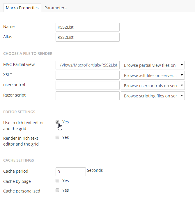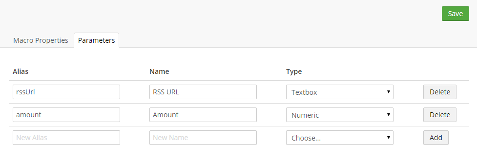 Now that we have our new macro created, Let’s add some parameters to it to make this even more customizable for your users. Expand the Macros area in the Developer section and click on the Parameters tab. We need to create 2 new parameters to allow us some extra flexibility and re-usability with this macro, just in case we want to use it multiple times in our site for different RSS feeds. Create the following two parameters on your macro and click the Save button when you are finished.