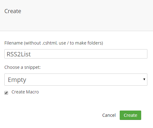 Name your new macro what works for you. Here I’ve named this RSS2List. Keep the Create Macro checkbox selected and Create your new macro.