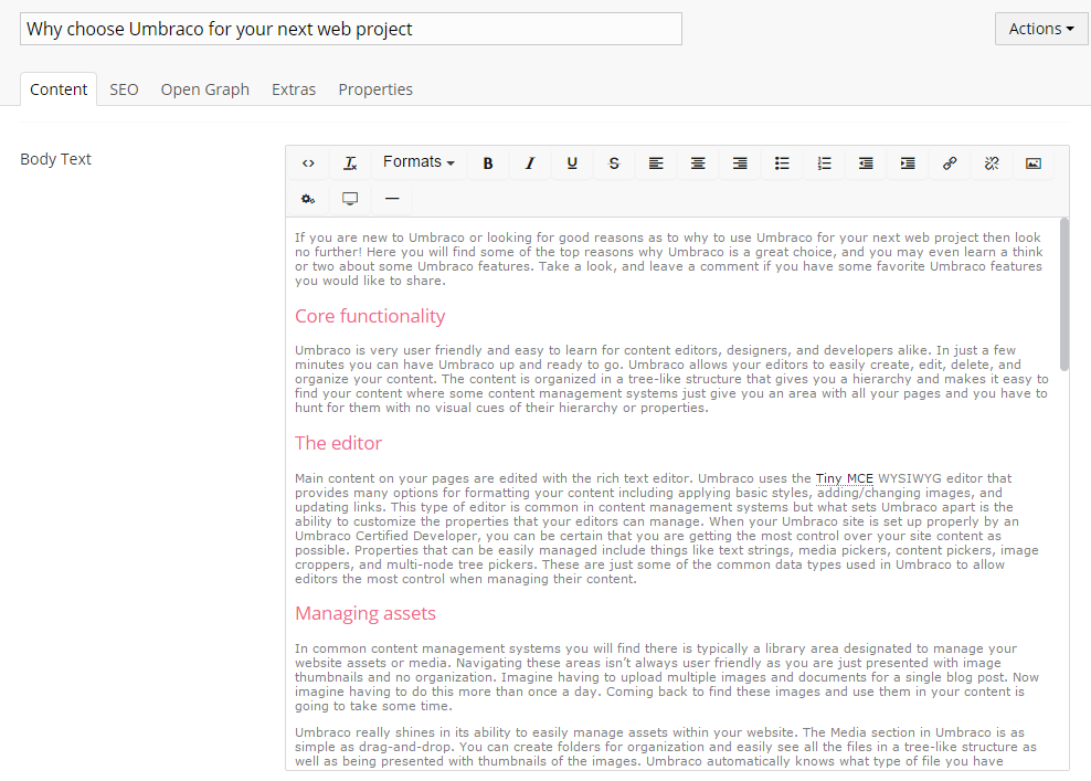 Umbraco is very user friendly and easy to learn for content editors, designers, and developers alike. In just a few minutes you can have Umbraco up and ready to go. Umbraco allows your editors to easily create, edit, delete, and organize your content. The content is organized in a tree-like structure that gives you a hierarchy and makes it easy to find your content where some content management systems just give you an area with all your pages and you have to hunt for them with no visual cues of their hierarchy or properties.