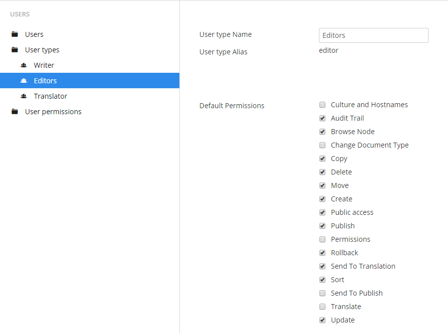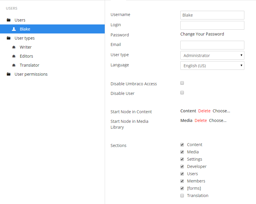 Since Umbraco is so customizable, it can scale quite easily to manage small or large websites, including the roles and permissions for people who manage the website. Umbraco’s User section allows editors who have access to this section to setup users who can manage anything with Umbraco. You can choose to only allow people access to certain sections, such as content and media, or limit them to a particular media folder and maybe just the ability to edit the blog on your site. You can also set permissions for users who just edit content and then send it to the publisher to be reviewed. All permissions are completely customizable in Umbraco by either setting up a user type as needed or editing your specific user’s permissions. Not only do you get the customization with roles and permissions, but you can also subscribe to email notifications on when content is updated. You actually can pick which individual item you would like to be notified of or choose them all! Be warned, depending on your amount of users managing the site it could be a lot of emails if you subscribe to everything.